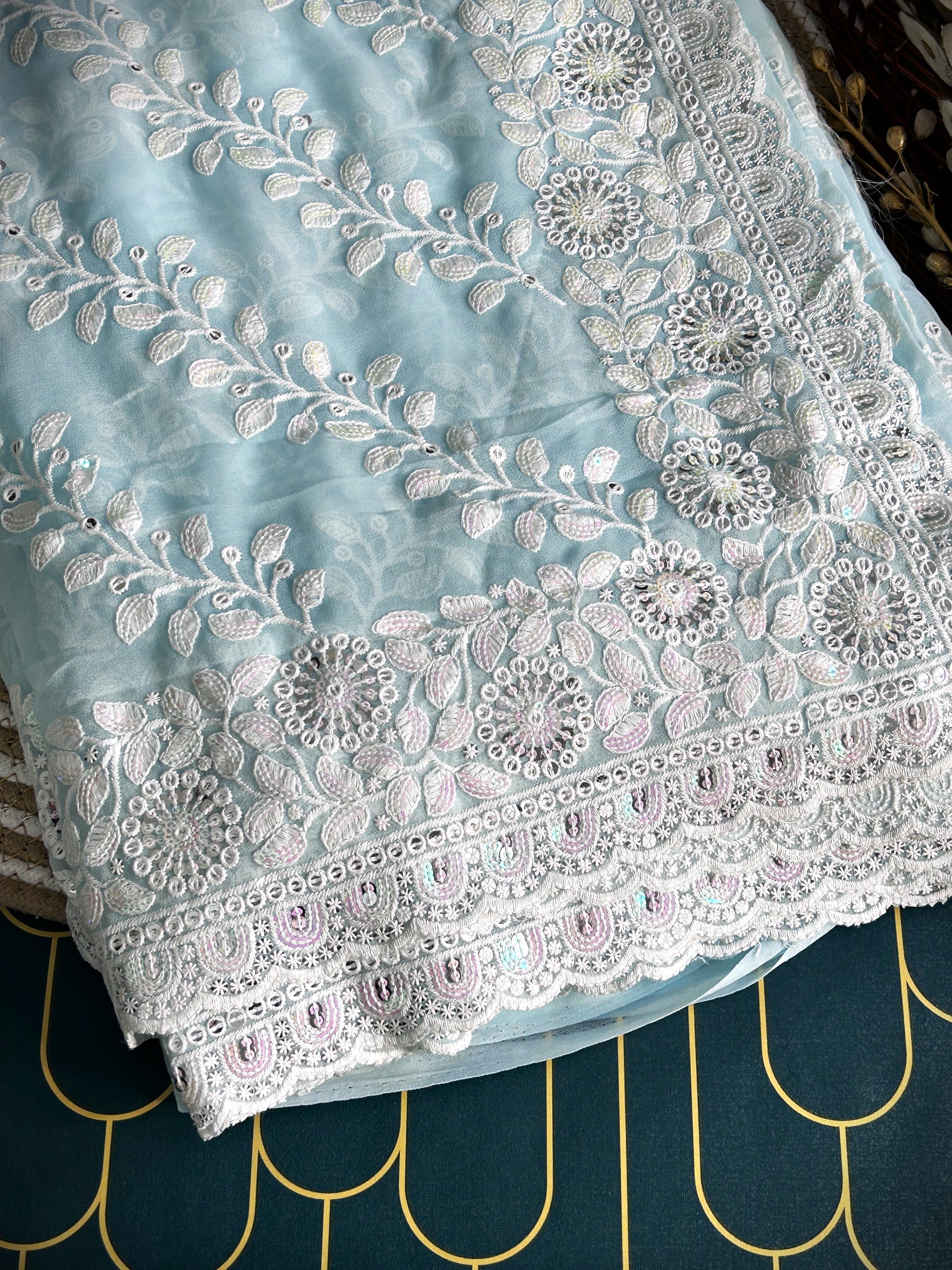 chiffon Saree with Chickenkari work | Sky Blue | Maguvaa Sarees