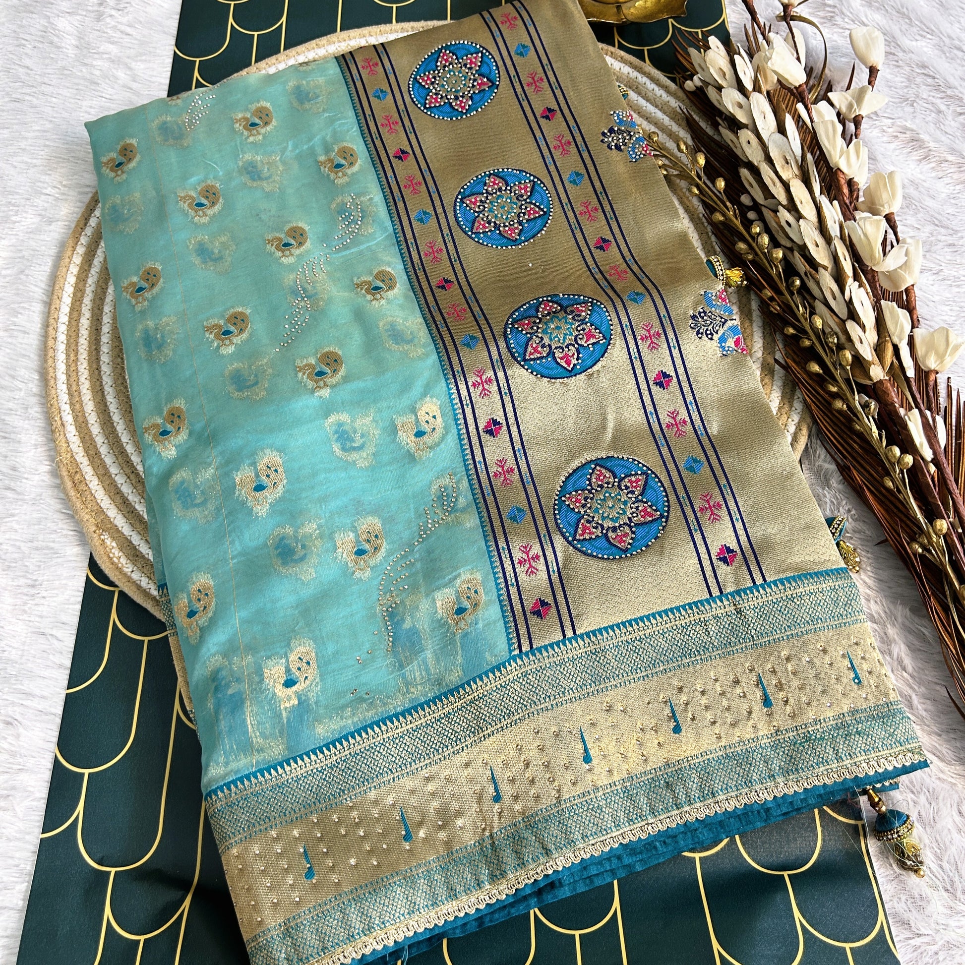 Glass Tissue with Paithani Borde with rich zarcon detailing | Blue/ Dark blue | Maguvaa Sarees