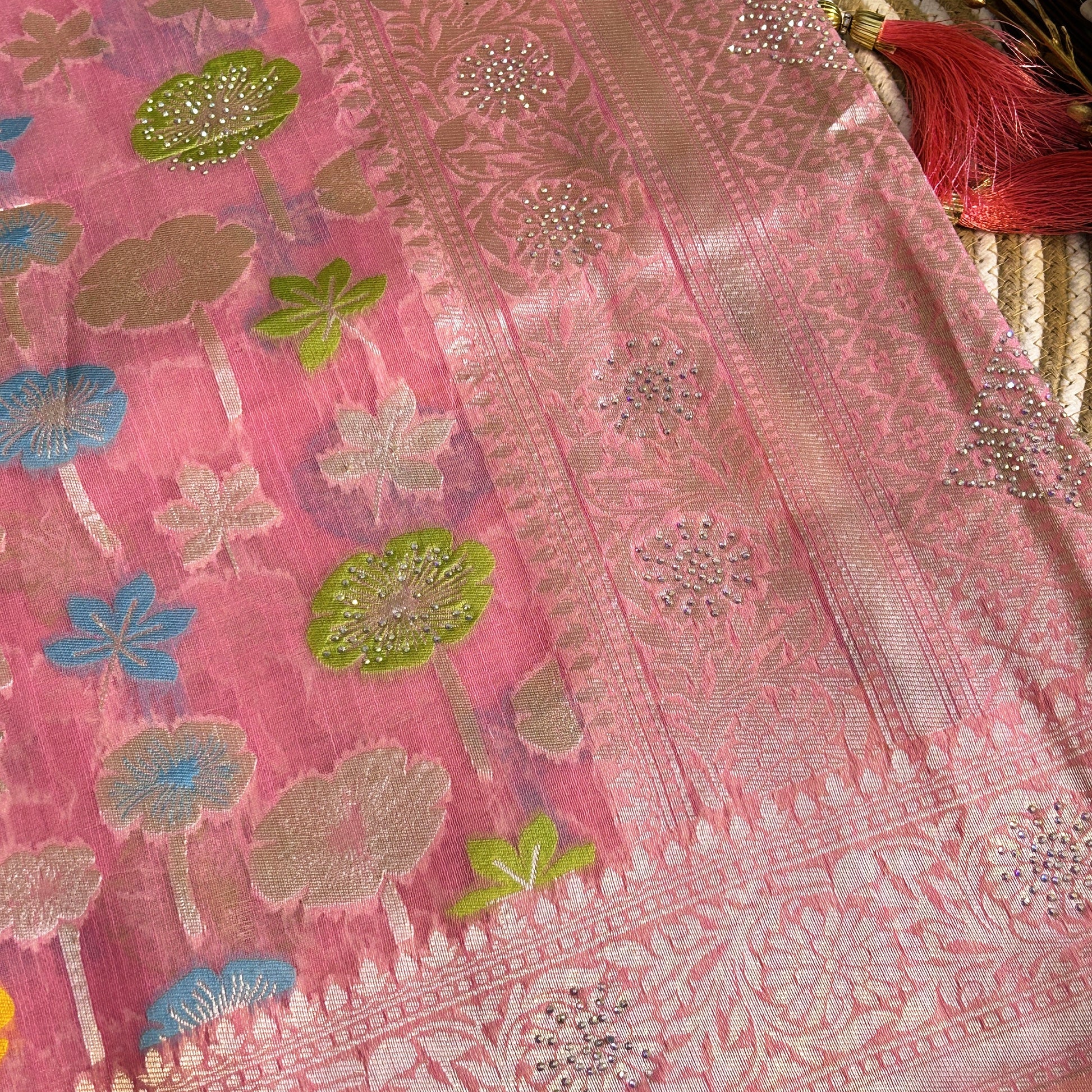 Linen Silk Saree with thread work zarcon detailing | pink | Maguvaa Sarees