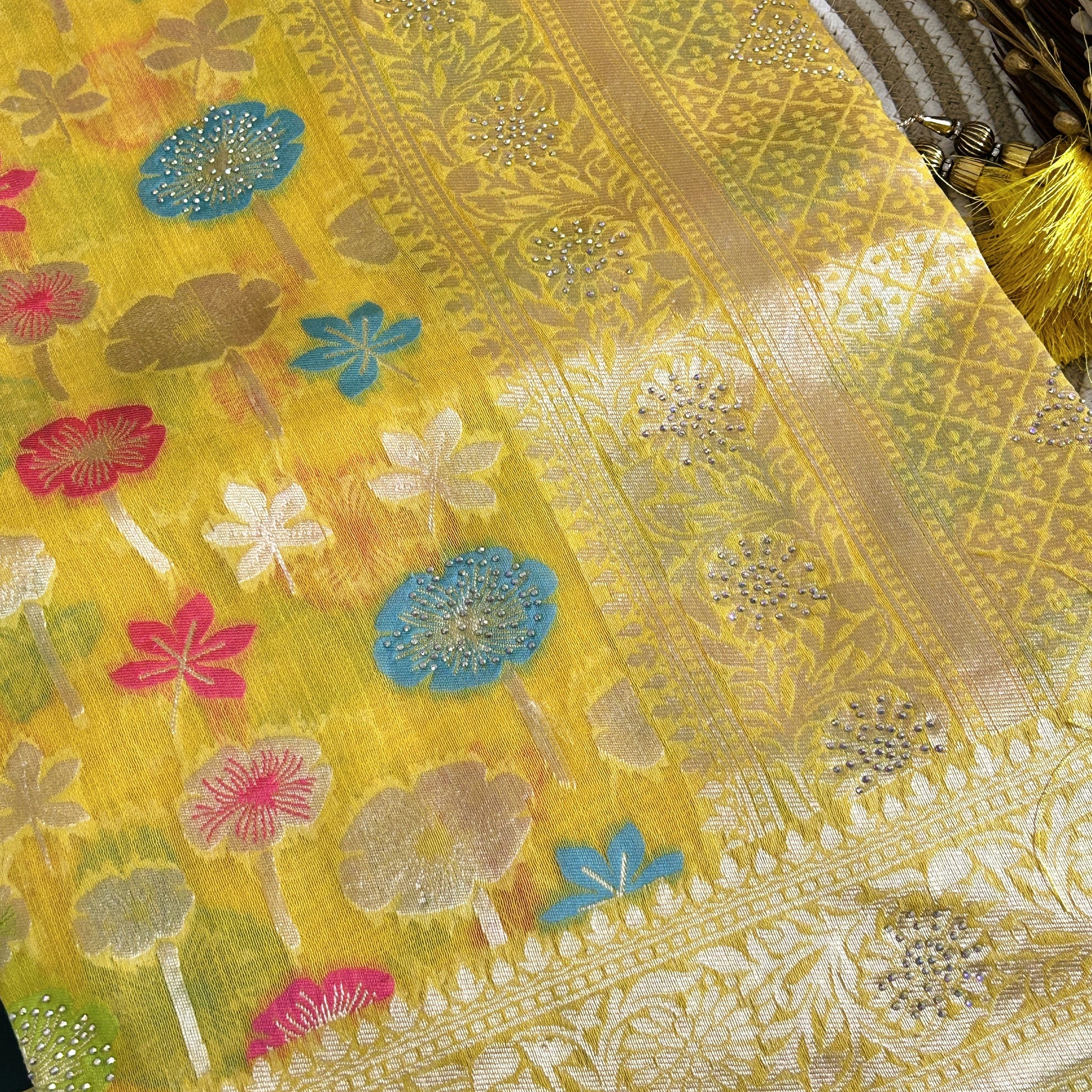 Linen Silk Saree with thread work zarcon detailing | yellow | Maguvaa Sarees