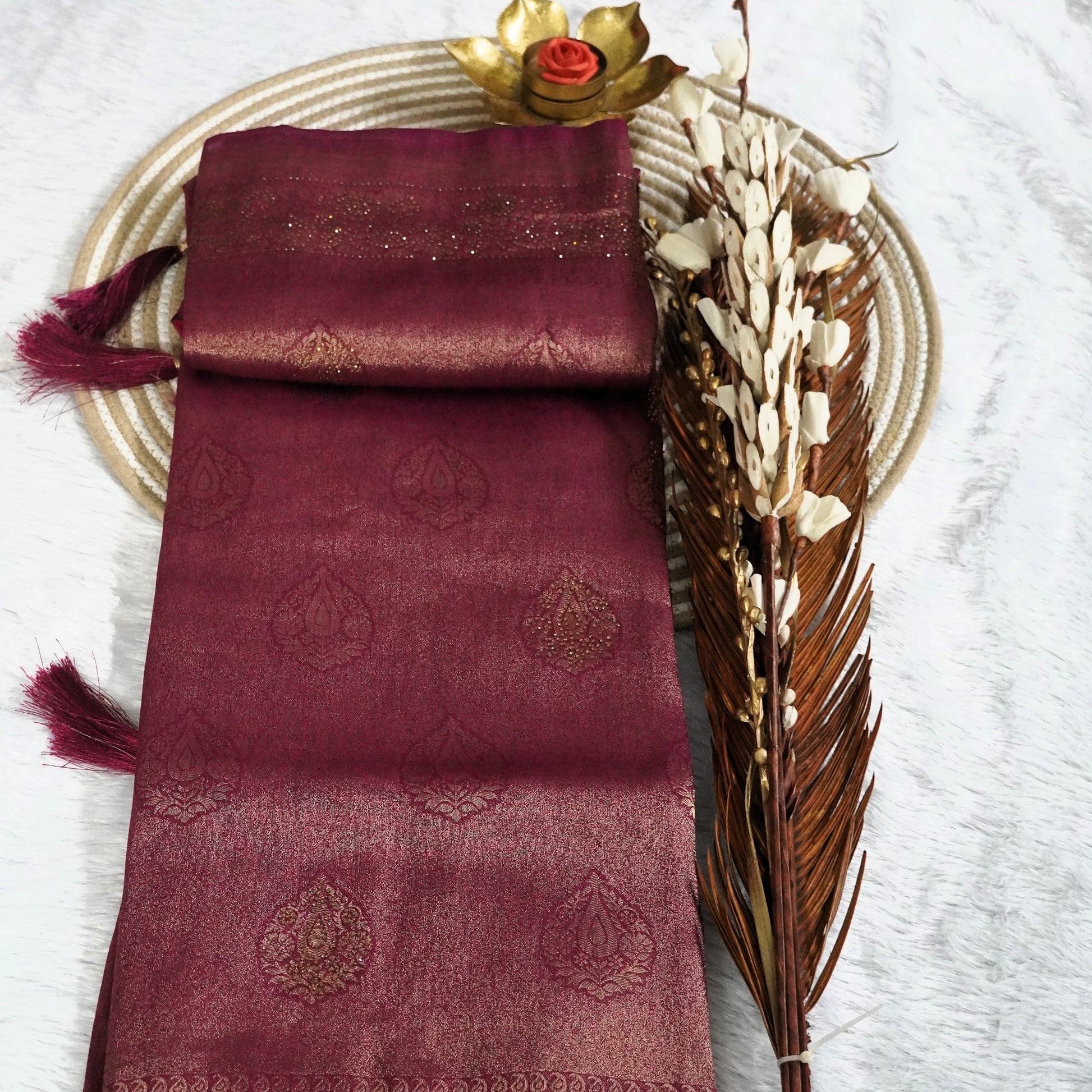 Tissue Saree with Zarcon work and all over detailing work | Wine Magenta | Maguvaa Sarees