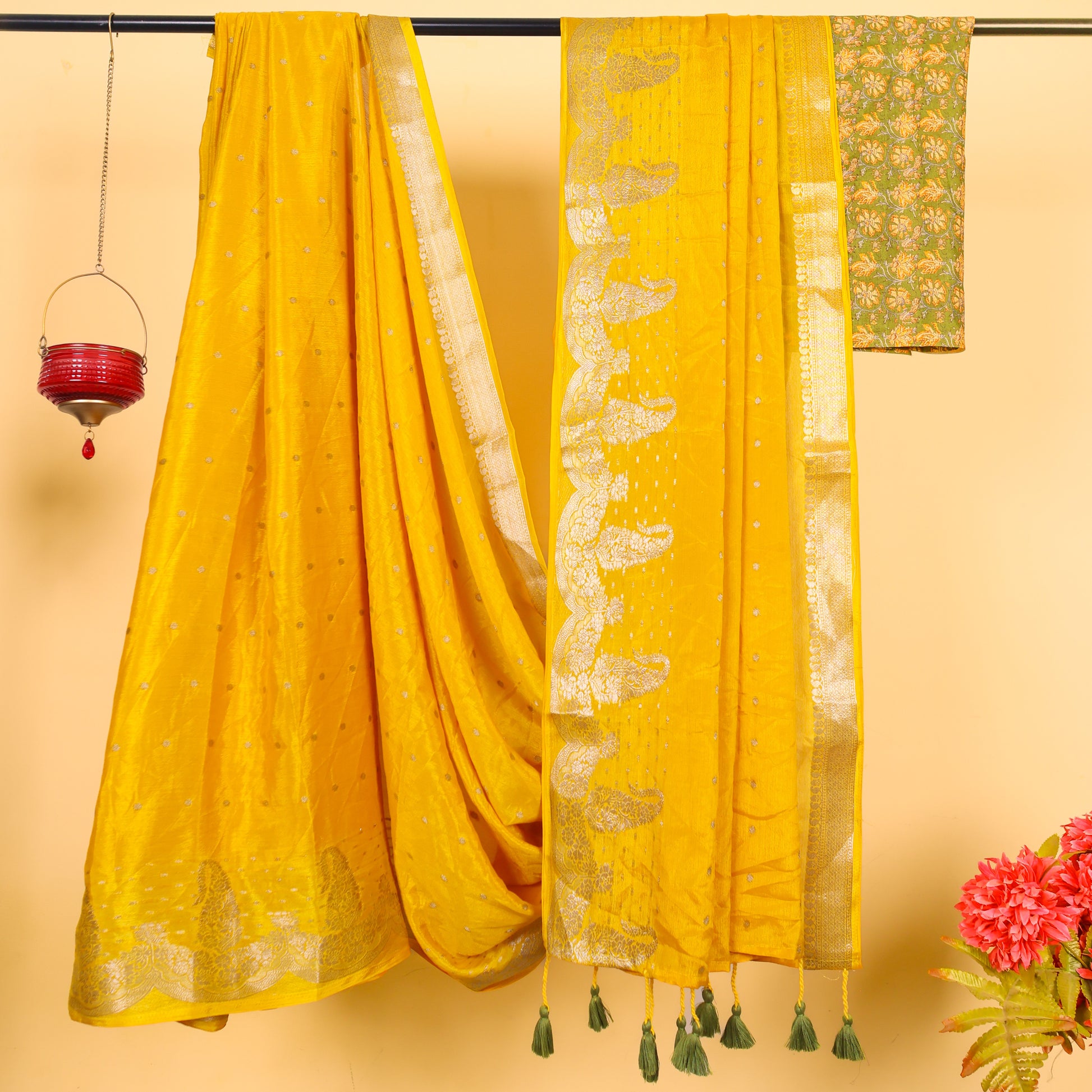 Brighten your festive look with this radiant yellow semi silk saree featuring exquisite silver zari weaving across the borders and pallu. The delicate butta motifs add a touch of elegance, while the contrasting green blouse piece with floral design brings out the richness of the ensemble. Lightweight, graceful, and effortlessly stylish, this saree is perfect for celebrations, weddings, and festive occasions.